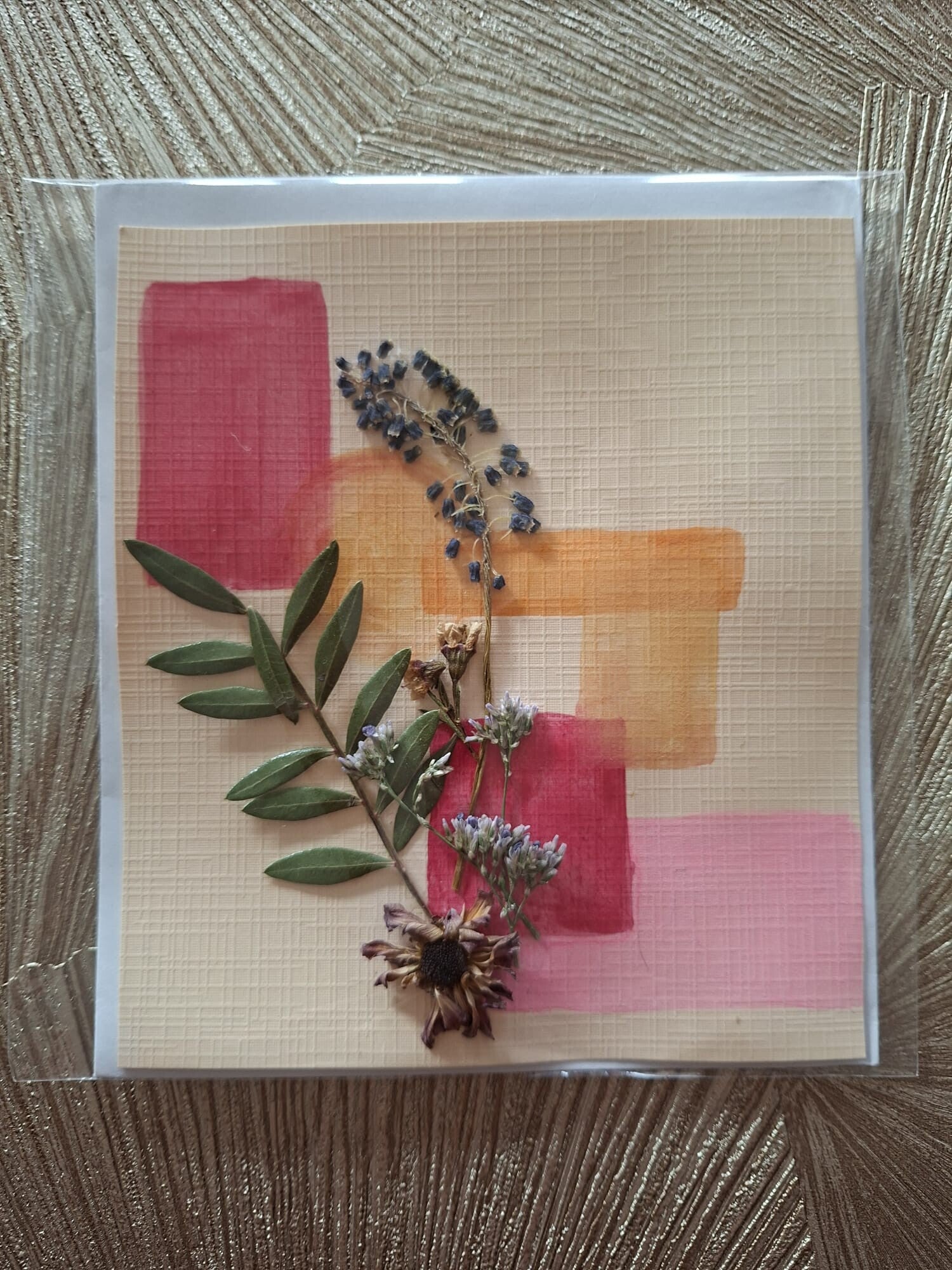 Op deze kaart zijn de gedroogde bloemen in al hun eenvoud verwerkt op een achtergrond met abstracte vlakken van aquarelverf. De enkele kaart is 12x13. Er wordt een bijpassende envelop meegeleverd. De kaart zit in een folie zakje verpakt.