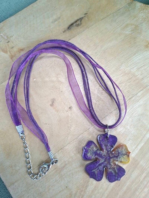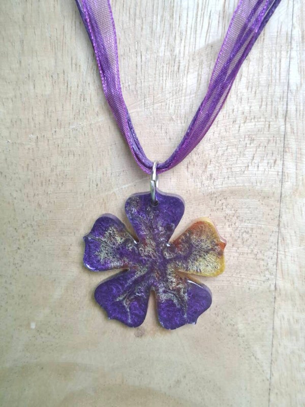 Deze ketting heeft een hanger in de vorm van een bloem. De hanger is gemaakt van epoxy met kleurpoeder in verschillende kleuren erin verwerkt.