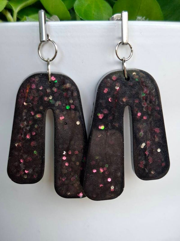 Oorbellen gemaakt van een diep zwarte kleur met prachtige glimmende glitters in diverse kleuren erin verwerkt. De oorbellen hebben mooie afwerking door de zilverkleurige rechthoekige vorm op de oorsteker.