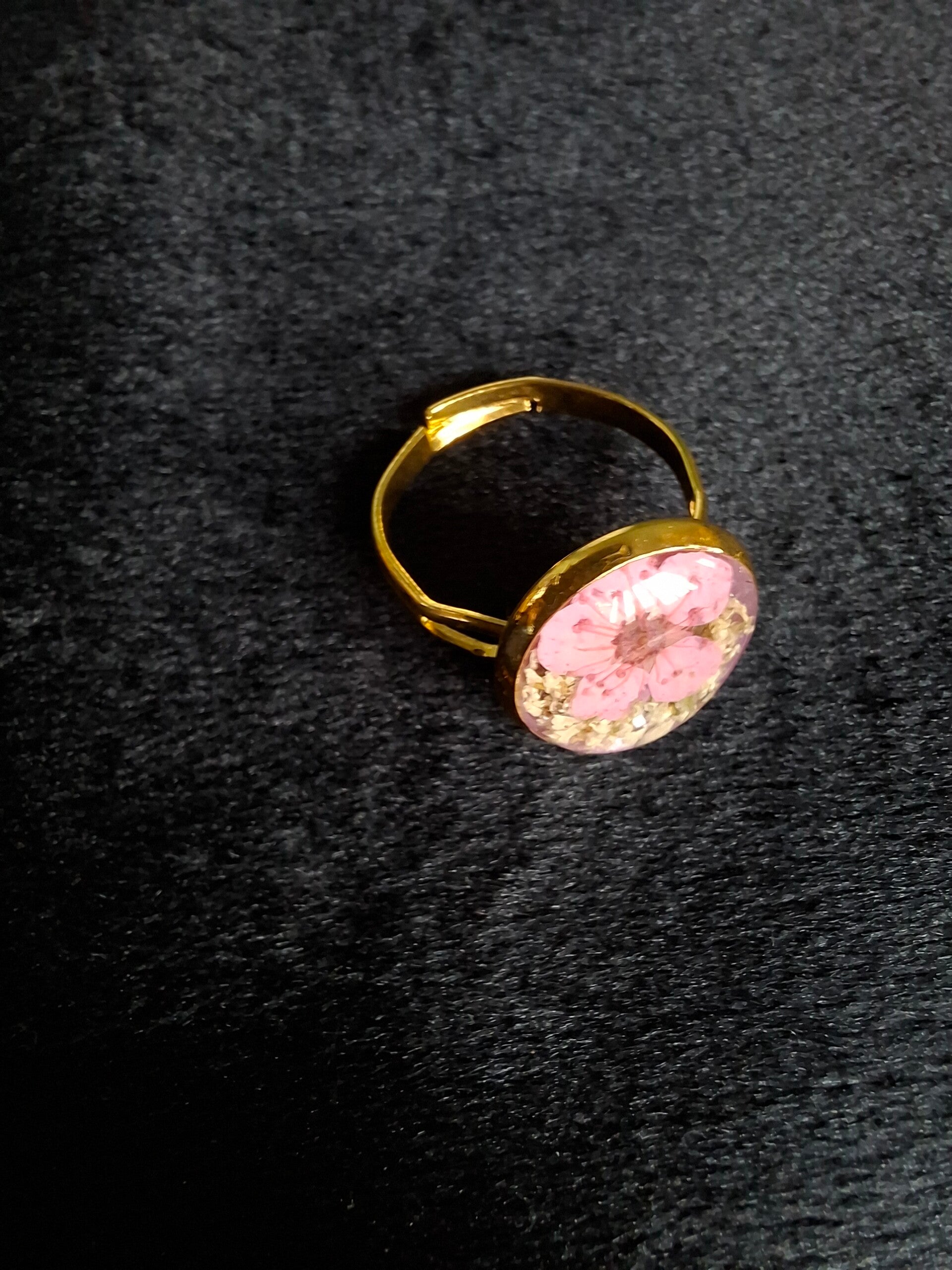 In deze ring zijn een mooi roze bloemetje en in de achtergrond een vleugje witte dille verwerkt.